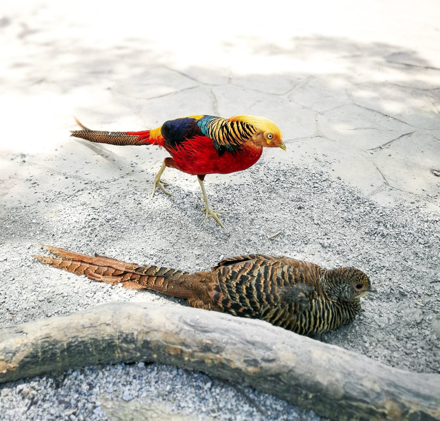 Yellow-cheeked Macaw, Goldfinches, Gouldian Finches, Golden Pheasant (so beautiful) and Zebra Finch